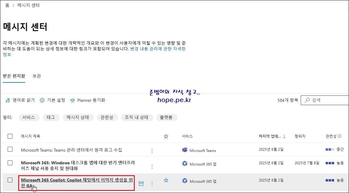 이처럼 Microsoft 365 메시지 센터에서는 Microsoft 365 주요 업데이트 내용에 대한 내용을 미리 확인할 수 있습니다.