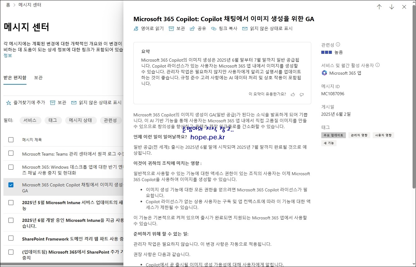 'Microsoft 365 Copilot: Copilot 채팅에서 이미지 생성을 위한 GA' 화면에서, 관련 메시지의 자세한 내용을 확인할 수 있습니다.