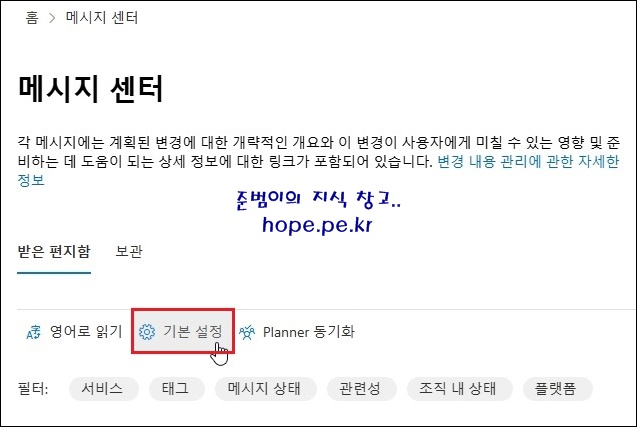 메시지 센터 화면에서, '기본 설정' 을 클릭 합니다.